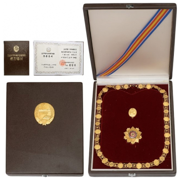 A 1st Class Collar Set of the 2nd type, as awarded to foreign dignitaries, with the rank of ministers upwards, belonged to Armeegeneral Heinz Kessler, former Minister of Defense of the German Democratic Republic: collar chain in gilt silver composed of 16 oval medallions bearing the coat of arms of North Korea, 17 round medallions with waving borders, centered by a stylized flower, all connected by triple segments of chain; a larger, separate link in the form of North Korea’s coat of arms, fitted with ring and hook to mount it to the collar chain and to which to append the Order’s Badge made of gilt Silver in the form of a reversed, five-pointed beaming star, each tip, with triple ball-finial, flanked by polished beams; the centre bearing a five pointed star, within enameled border with the colours of the Korean flag; the reverse, fitted with a hook pointing downwards and raised Korean inscription with the indication of the class “1”; in the original case of issue with fitted inner compartment and Korean coat of arms in gilt metal to the outer lid; with the original award document dated July 14th, 1988 (decision of the Central Committee, in the name of Comrade Kim Il-Sung) and the date of the award, on July 15th; in the original, dark brown leather folder.