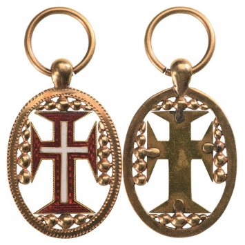 An early Order’s badge of reduced size in Gold as an oval, openwork medallion with finely chiseled details, enclosing the Order’s cross, its obverse with red and white enamels, the arms, ending with small sphaeres; smooth, polished reverse; sphaerical loop with round, ribbon ring.