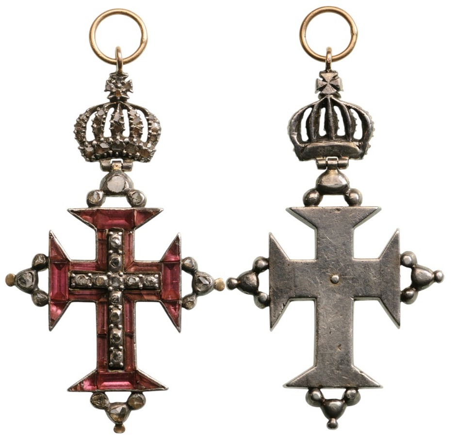 A jewelled decoration of reduced size: the order’s cross, completely set with rose-red stones, centered by a latin cross, set with Diamonds; the border of each arm, enriched by 3 diamonds; hinged upper crown, profusely set with diamonds; suspension ring in gold; smooth reverse, with one centre rivet.