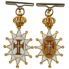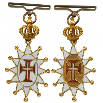 An early badge of the Order in Gold as a 12-pointed, white enameled star with ball finials (except the upper one, fitted with suspension loop), the obverse with the red enameled Order’s cross on white enameled oval medallion; similar reverse side, but the centre medallion in gold, also centrered with the Order’s cross; above, Royal crown with round link-ring and horizontal, suspension bar.