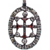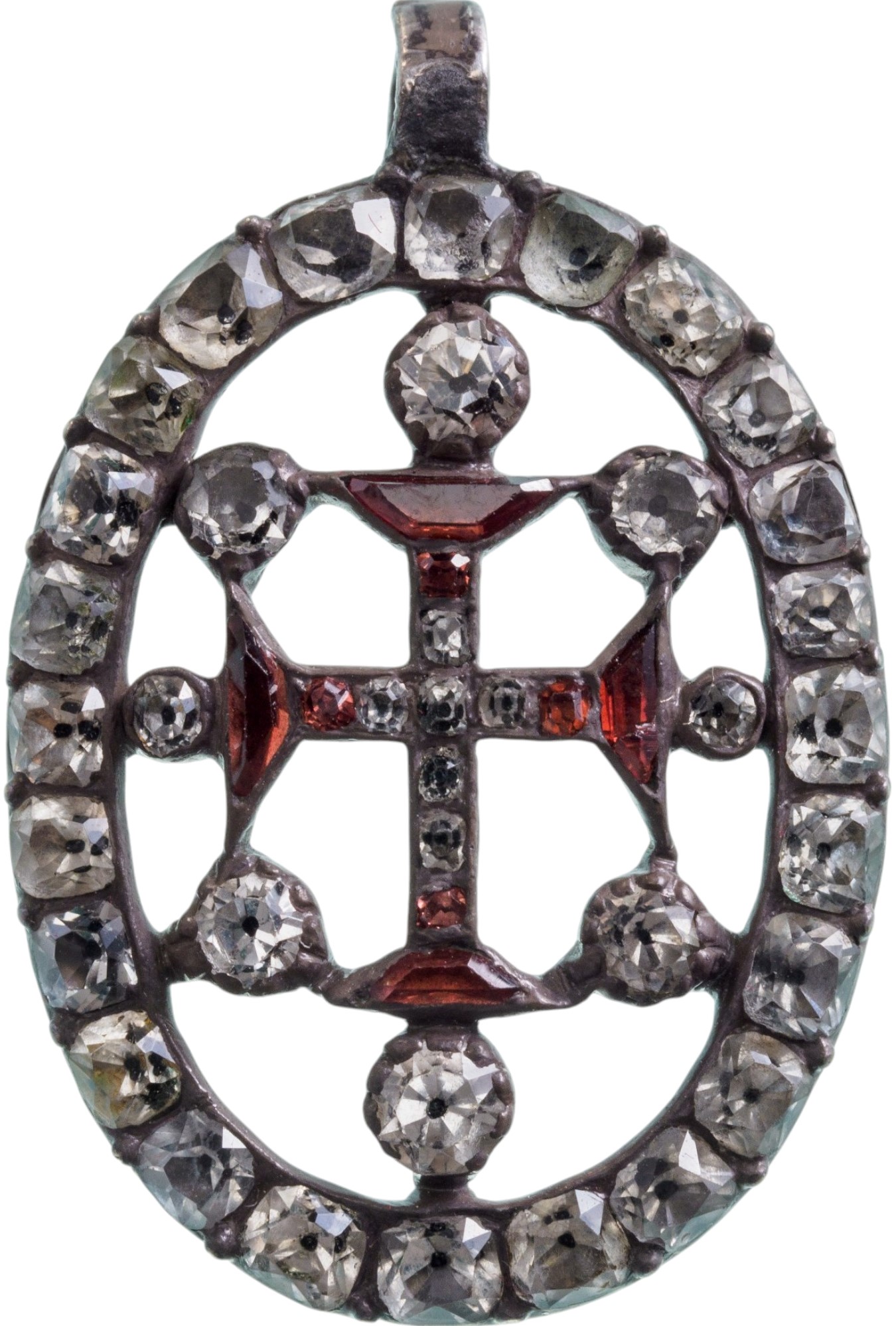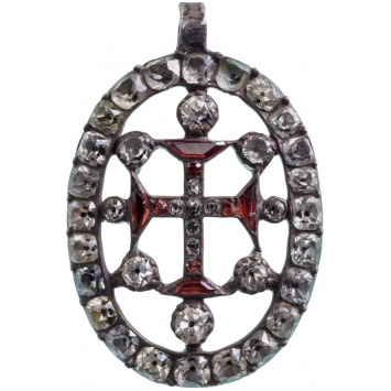 A jewelled badge of the Order: Silver, oval, openwork medallion, completely set with white stones, bearing the Order’s cross to the centre, this set with red pastes and centered by a smaller cross, set with tiny diamonds, the whole flanked by further diamonds and cylindrical, small upper suspension loop; smooth reverse.