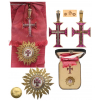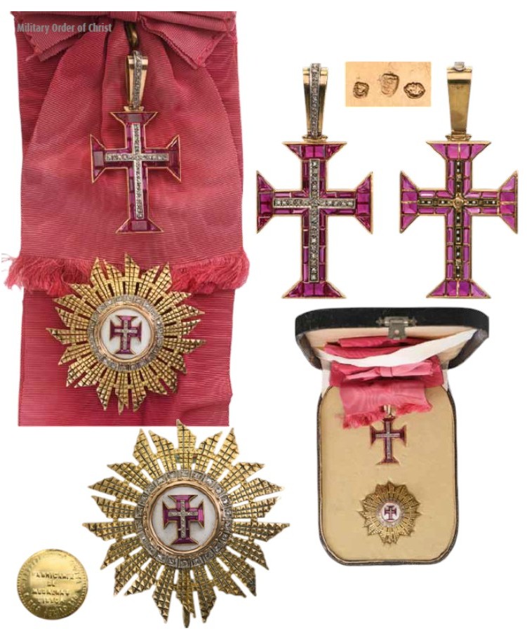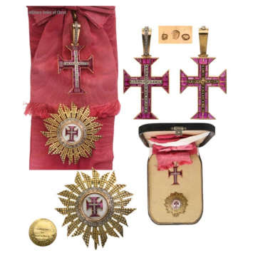 A jewelled set of the Order: Sash Badge in Gold, profusely set with red stones, centered by Christ’s Cross in silver, set with diamonds; short, upper loop and tapering suspension ring, its obverse face enriched with briliants The reverse, struck with three Portuguese marks; with original, silk, full length sash; breast star with chiseled rays in gold; white enameled centre medallion with the order’s cross in gold, set with red stones and brilliants, within moulded and beaded border in gold, the whole surrounded by an outer circlet set with 22 brilliants; smooth reverse, the counter-medallion bearing the embosses escutcheon of the maker, Da Costa, Lisbon and fitted with vertical pin; in the original leather case of issue, with fitted inner compartment.