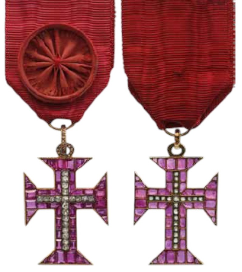 A jewelled Officer’s Cross of the Order in Gold, completely set with red stones and centered with a cross set with diamonds; loop and link-ring also set with diamonds; smooth round ring and original, red silk ribbon with rosette.