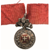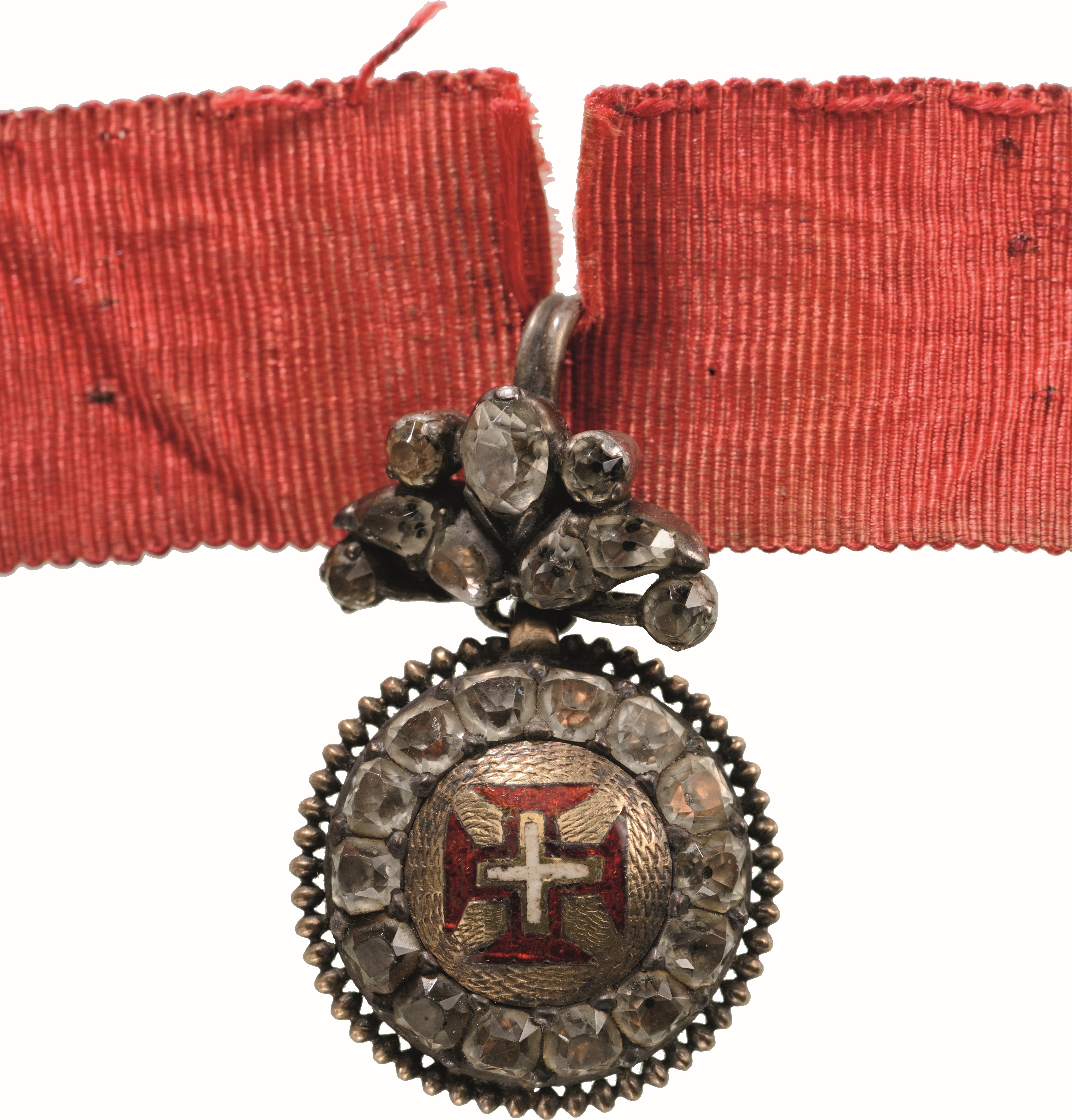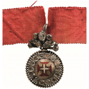 An early badge of the Order of reduced size: round medallion bearing the enameled Order’s cross within a circlet of brilliants and a silver, outer beaded border; hinged suspension, completely set of brilliants, forming a stylized pattern of leaves and grooved ribbon ring to its reverse; with original, silk ribbon.