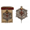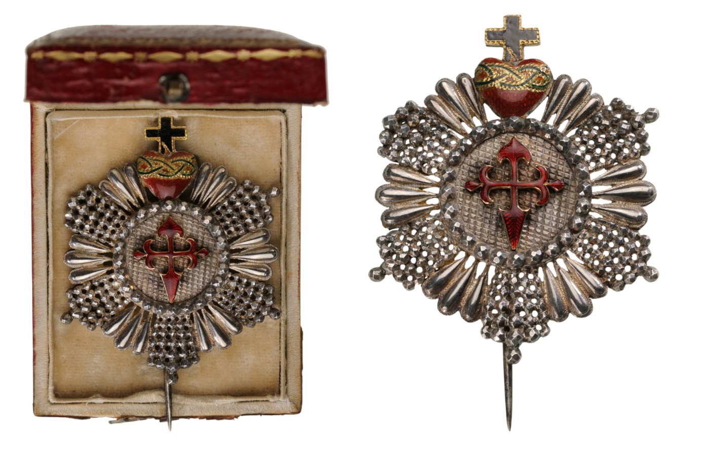An early Breast Star of the Order: silver rays, alternately diamond-cut chiseled and pierced (one ball- finial, wanting) and smooth; “waffle” engraved centre medallion with the order’s cross in gold and translucent red enamel, within diamond-cut outer circlet; upper, sacred heart in gold and enamels; smooth reverse, with round, counter-medallion and long, round pin; in the original, gold embossed, red morocco case of issue, with ivory-white velvet and silk inner compartment.