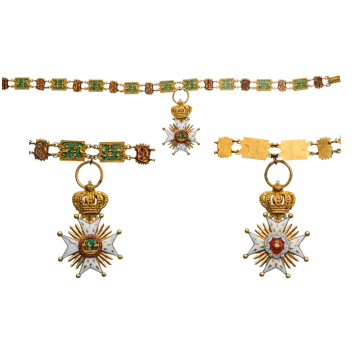 In Gold, made of ten, green enameled links depicting the scene of St. Hubert and the deer and nine, red enameled monograms “CT” and a sliding closure, all linked together by small, gold rings; to the mid-length, the Order’s badge is appended, as a white enameled cross with ball finials, flanked by bundles of three beams each, the arms enriched with gold flames; green enameled obverse centre medallion with the St. Hubert’s scene in gold and red enameled outer circlet with the Order’s motto “in TRAW FAST”; red enameled reverse centre medallion with a gold-embossed orb; the outer circlet as a waving scroll, bearing the black miniature painted inscription “in MEMORIAM RECUPENTAE DINGNI. AVITAE” and, below, “1708”; upper loop as chiseled acanthus leaves to which the Royal Bavarian crown is hinged; round, grooved suspension ring.