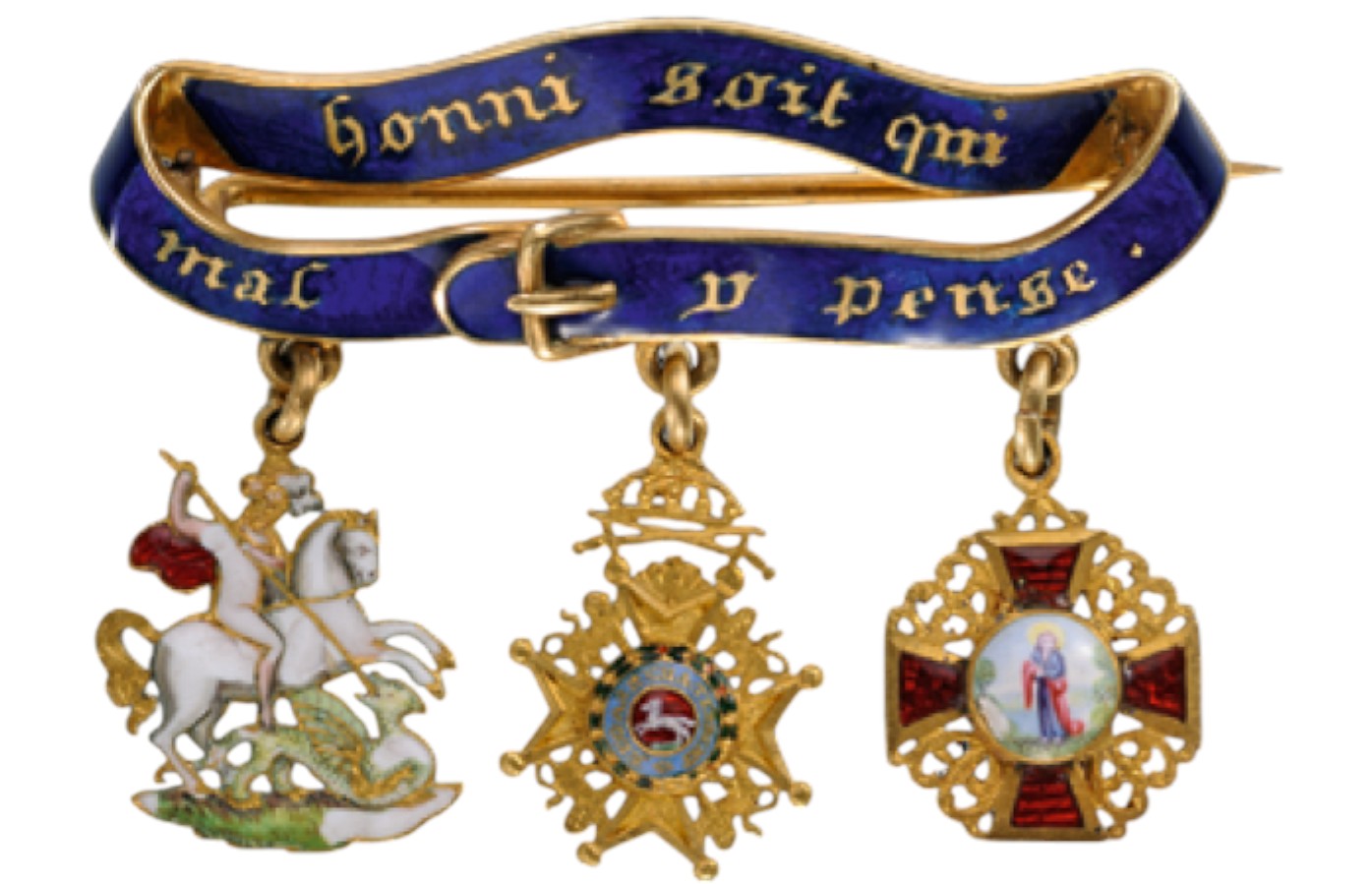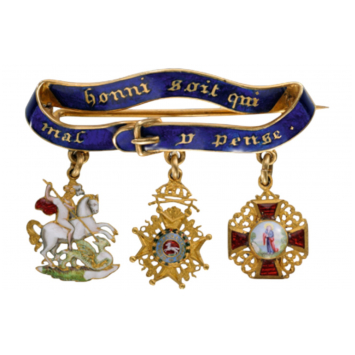 An outstanding miniature bar: blue enameled scroll in the form of a closed, golden “Garter” with buckle, bearing the Order’s motto “HONNI SOIT QUI MAL Y PENSE” in golden, gothic lettering, to which are appended the miniatures of the St. George in gold, enriched by excellent, poly-chrome, miniature enamelwork, giving the piece with excellent detail; the badge of the Hanoverian Guelphic Order with Swords in Gold, with excellently-made, enameled centre medallion and the miniature of the Imperial Russian Order of St. Anne, also in Gold, with red enameled arms and excellently painted, obverse and reverse centre medallions; suspension bar with horizontal, golden pin to the reverse.