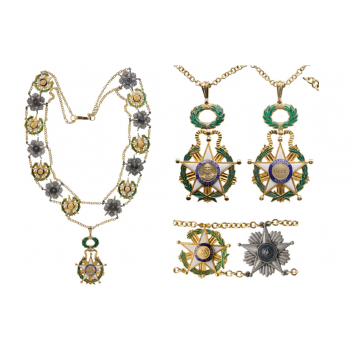 A Special Class “Mariscal Francisco Solano Lopez” Collar, composed of 7 Golden links made as the Order’s badge, with enameled details and 7 Silver links made as the Order’s Breast Star, all linked by means of thin chainlets; Badge of the Order in gilt Silver: five pointed, white enameled, gold bordered star, flanked by straight, polished rays and surrounded by green enameled laurel and palm wreath; centre medallion with bust of General F. Solano Lopez, within blue enameled outer circlet bearing the inscription “MARISCAL FRANCISO SOLANO LOPEZ HONOR ET GLORIA”; reverse medallion with the year “1865” on pebbled ground, within blue enameled outer circlet bearing the Order’s motto “PRAEMIVM MERITI”; above a waving scroll forming the upper loop, linked to a horizontal laurel wreath; upper, moulded, tapering suspension ring.