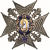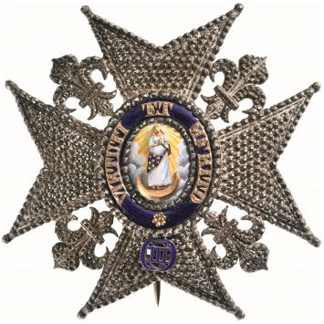 A Grand Cross Star in Silver with finely chiseled and pierced arms and fleurs-de-lys; centre medallion with exceptionally executed image of the Virgin in gold and polychrome enamel, standing on a crescent of polished gold; enameled background with clouds and beams; deep-blue enameled outer circlet bearing the order’s motto with separately-made lettering made of chiseled gold and the blue enameled monogram below; concave reverse, fitted with vertical pin.