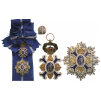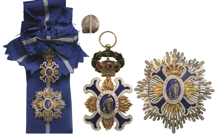 A Grand Cross Set of the first model: Sash Badge in Gold with white bordered, deep sea-blue enameled arms, flanked by chiseled, golden flames; blue enameled, oval centre medallion with allegoric image made of toned silver, within white enameled outer circlet, bearing the Order’s motto; the upper “flame” with hinged royal crown enriched by red enameled inner cap, resting on green enameled laurel wreath; sphaerical loop and round ring; with original, silk sash ribbon; Breast Star with chiseled and polished rays; the centre made of gold, en-suite with the sash badge, also with finely chiseled/polished golden flames, royal crown between the centre’s upper arms, with red enameled inner details; polished reverse, bearing the maker’s escutcheon of Medina, Barcelona and Madrid; vertical pin.