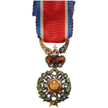 A jewelled miniature of the order in Gold and enamels; the arms, the upper orb and the suspension ring, set with tiny diamonds; original ribbon.