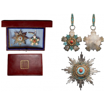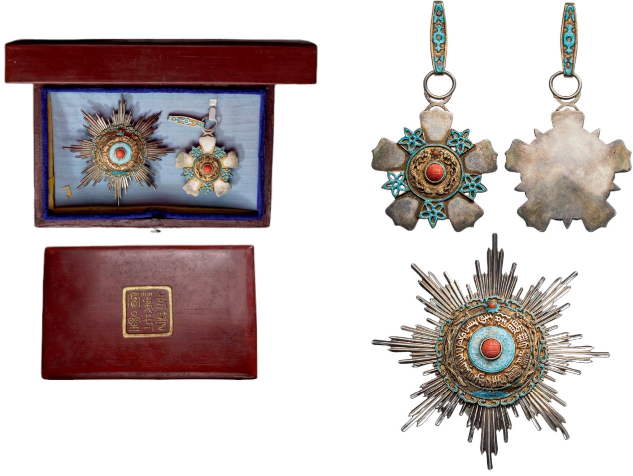 A complete set of the 2nd Class, 2nd Grade, instituted in 1882. Sash Badge, in Silver, as a stylized flower, the centre as a carved red coral within two raised, golden dragons, facing a further, smaller red coral, the whole within elaborate, sky-blue enameled pattern with red enameled endings, round suspension loop, smooth reverse, long suspension ring, the outer side with blue enameled, ornamental pattern. Breast Star, in Silver with smooth, polished rays, round centre with a carved red coral within pale-blue enameled border as a stylized chain, within gilt outer circlet bearing raised, Chinese inscription in archaic script within thin, blue enameled border and around, two dragons facing each other with a small, red coral set on a pale-blue enameled beaming star, the whole enclosed within a sky-blue enameled ornamental pattern, the reverse, fitted with vertical pin, the set, in its original, brown case of issue with golden, archaic Chinese inscription on the lid, blue velvet, fitted inner compartment, the inner lid, lined with yellow silk and red silk cushion.