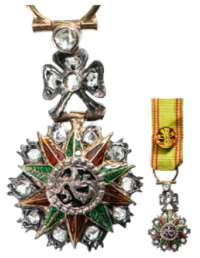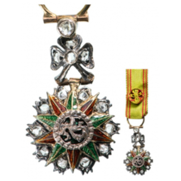 A jewelled miniature of the Order (of the Officer’s Class) with red/green enameled, ten-pointed star in Gold, flanked by stylized ornaments set with tiny diamonds; green enameled centre medallion with openwork, chiseled Bey’s monogram; hinged, bow-shaped suspension set with brilliants; suspension ring in gold and original, silk ribbon with rosette.