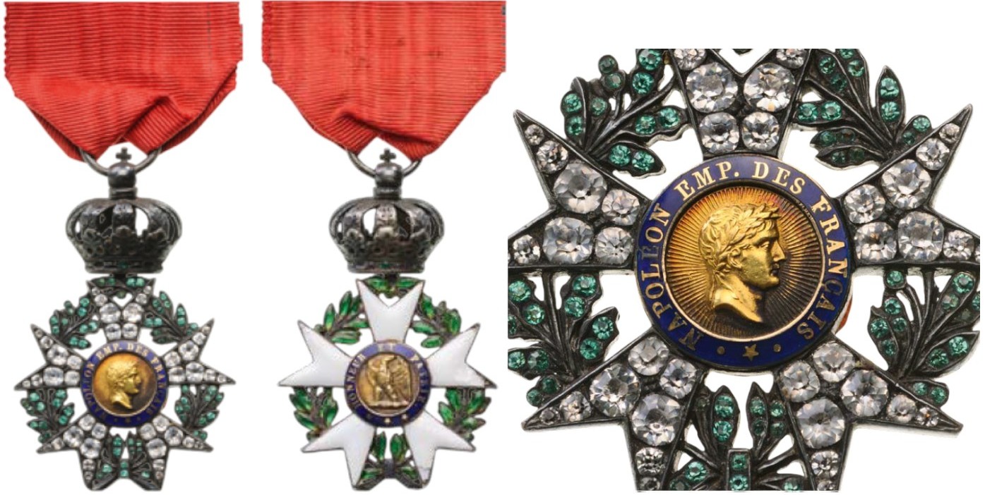 A “jewelled” Knight’s Badge in Silver, with obverse arms completely set with diamonds; laurel and oak leaves also set with green emeralds, cut stones; centre medallion made of two parts in gold with Napoleon’s portrait, blue enameled medallion’s outer circlet with inscription “NAPOLEON EMP. DES FRANCAIS” in Gold; reverse and suspension crown (this, corresponding to the 3rd type), like the “normal” decorations; The link between the badge and the crown, with a “boar’s head” mark, struck for a subsequent sale of the piece in auction, after 1838; suspension ring struck with the “fasces” mark (1809-1819); with ancient ribbon.
