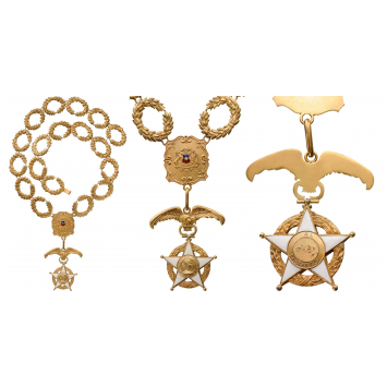 Collar of the order, instituted in 1906, in gilt Silver, composed by 18 laurel wreaths and a centre link made as an ornamented escutcheon, bearing the state`s coat-of-arms, with enameled details, the badge in gilt silver and white enamel, the suspension in the form of a Condor with spreaded wings. A beautiful, very rare collar, awarded to heads of state only, excellent condition. Dim. of the badge, 62,0 x 61,0 mm. I RR!