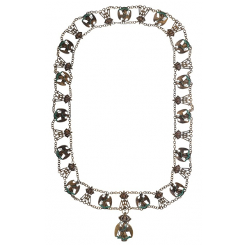 A Collar of the Order in gilt Silver, composed of 15 crowned monograms “MIM”, the crowns with enameled details and 15 “Mexican” eagles with green enameled cactus and snake, all linked by segments of chain made of oval, closed rings; the forward, centre crowned monogram with appended Order’s badge in the form of the Mexican Eagle, this, excellently chiseled and detailed, resting on green enameled cactus and holding the green enameled snake in the beak and crossed sceptres; above, the Mexican, Imperial crown with enameled details; round suspension ring, linked to the reverse of the above mentioned, crowned monogram.