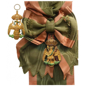 A Grand Cross Badge of the Order in silver Gilt: the eagle, resting on a light-green enameled cactus, holding a green enameled snake in the beak, its body obliquely running to the obverse; crossed sword and scepter; hinged, upper crown with enameled details; the orb surmounted by a fleur de lys, smooth suspension ring; with a length of original, sash riband.