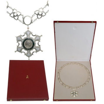 Collar of the Order in Silver, Civil division, composed by 13 “o” links; 13 ornamental links of a moresque pattern, all connected by short sections of chain; the 13th “o” link, fitted withy round loop to which the white silver badge is appended, as a red enameled, six-pointed star of peculiar, moresque design, bordered with pastes and flanked by the Sultanate symbol of the Jambiya dagger and crossed blades; centre medallion with embossed, calligraphic, Arab inscription, within border set with pastes; green enameled outer circlet, bearing long calligraphic Arab inscription; smooth, concave reverse; in the original, large, red presentation case, with ivory colour, fitted inner compartment.