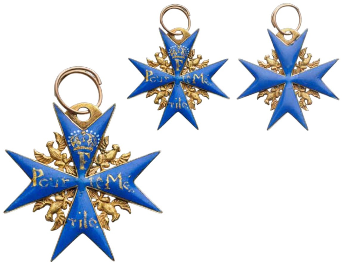 A Neck Badge of the Order in Gold: blue enameled cross of Maltese type, flanked by Prussian eagles in Gold; the upper arm, bearing the crowned monogram “F”, while the other three arms bearing the motto “POUR / LE ME / RITE” in gold foil within the enamel itself; the reverse with convex, blue enamel, upper loop drilled with a hole, fitted with the original, round suspension ring.
