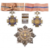 A Grand Officer’s Set of the Military Class: Neck Badge in gilt Silver with polished arms formed as groups of four dagger-shaped beams, flanked by deep-sea blue enameled stylized mounts and rising double crosses; centre medallion with bust of the prince facing left within beaming outer circlet and blue enameled border; the reverse centre medallion depicting an archaic church within the motto “SAECULO NONO INSTANTE FUNDAVIT”, also within beaming outer circlet and blue enameled border; hinged crossed swords and laurel wreath and suspension ring (struck with marks to the reverse); original neck ribbon (frail); Silver Breast Star with strong, faceted rays flanked by stylized arrow-tails; the centre as the badge of the order, but of reduced size, in gilt silver and deep-sea blue enameled details, within gilt silver-bordered, geometrical frame, flanked by silver, crossed swords; concave reverse with two nuts retaining the obverse and a scratched number “1409”; horizontal, strong round pin, struck with “987” and “K” marks.