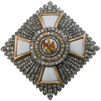 A jewelled Breast Star to the 2nd Class with silver rays, completely set with brilliants of different- sizes; the centre with white enameled Order’s Cross with broad golden borders; white enameled centre medallion with separately made, red enameled Brandenburg eagle of earlier type, holding green enameled laurel wreath, within thin circlet, completely set with tiny brilliants; white enameled outer circlet with motto “SINCERE ET CONSTATER”, separately made of gold with chiseled details, the whole enclosed by a border set with brilliants of larger size; the reverse, showing the complicate assembly of the piece, fitted with vertical, gilt silver pin.