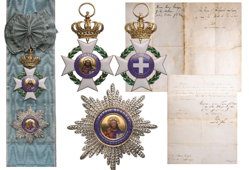 Early 2nd type Sash Badge in Gold (Bavarian type, with originally changed medallions) with white enameled arms flanked by green enameled oak and laurel wreath; the obverse medallion, with finely painted portrait of the Saviour, within blue enameled outer circlet bearing golden inscription; blue enameled reverse medallion with gold-bordered, white enameled cross; blue enameled outer circlet with golden inscription; thin, round upper loop, to which the royal crown is linked by means of a “U”-shaped loop connected to the crown’s base (typical detail of the early “Bavarian” type); round suspension ring and original, full sash ribbon with bow; Breast Star in Silver with chiseled and pierced rays; centre medallion in gold with miniature-enameled portrait of the Saviour within beaded, golden borders enclosing the convex, blue enameled outer circlet bearing golden inscription; polished reverse with vertical, round pin; together, the original letters from King George to his “Très Affectionné Frère et Cousin”, the Duke of Cambridge.