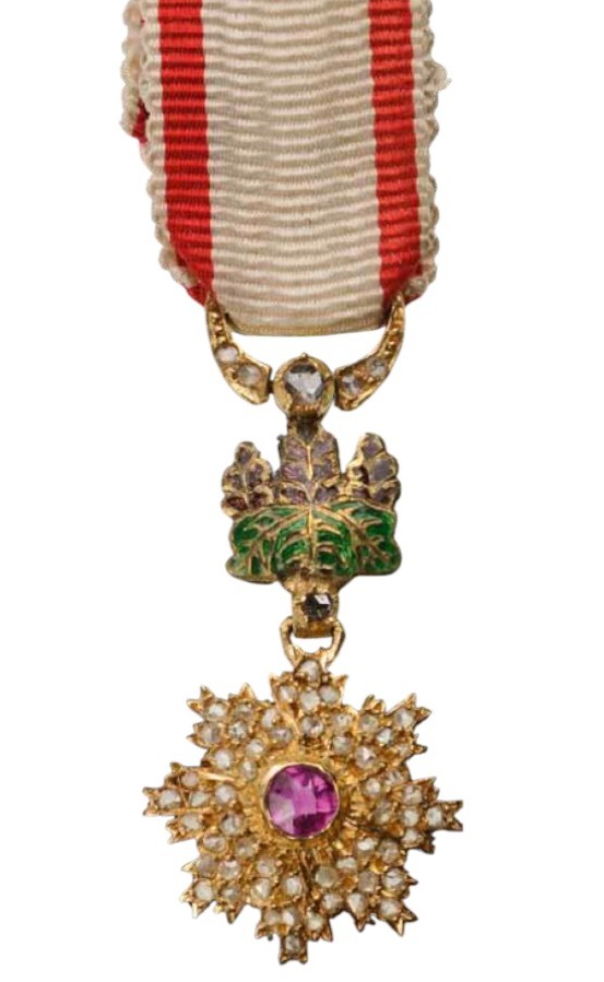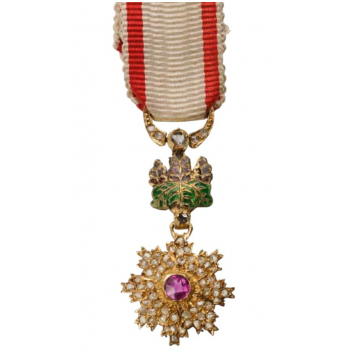 A jewelled miniature of the Order in Gold, set with 62 diamonds, for a total of 0,105 ct.; centre medallion in gold with one ruby for a total of 0,12 ct.; suspension ring in gold; with original ribbon.