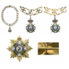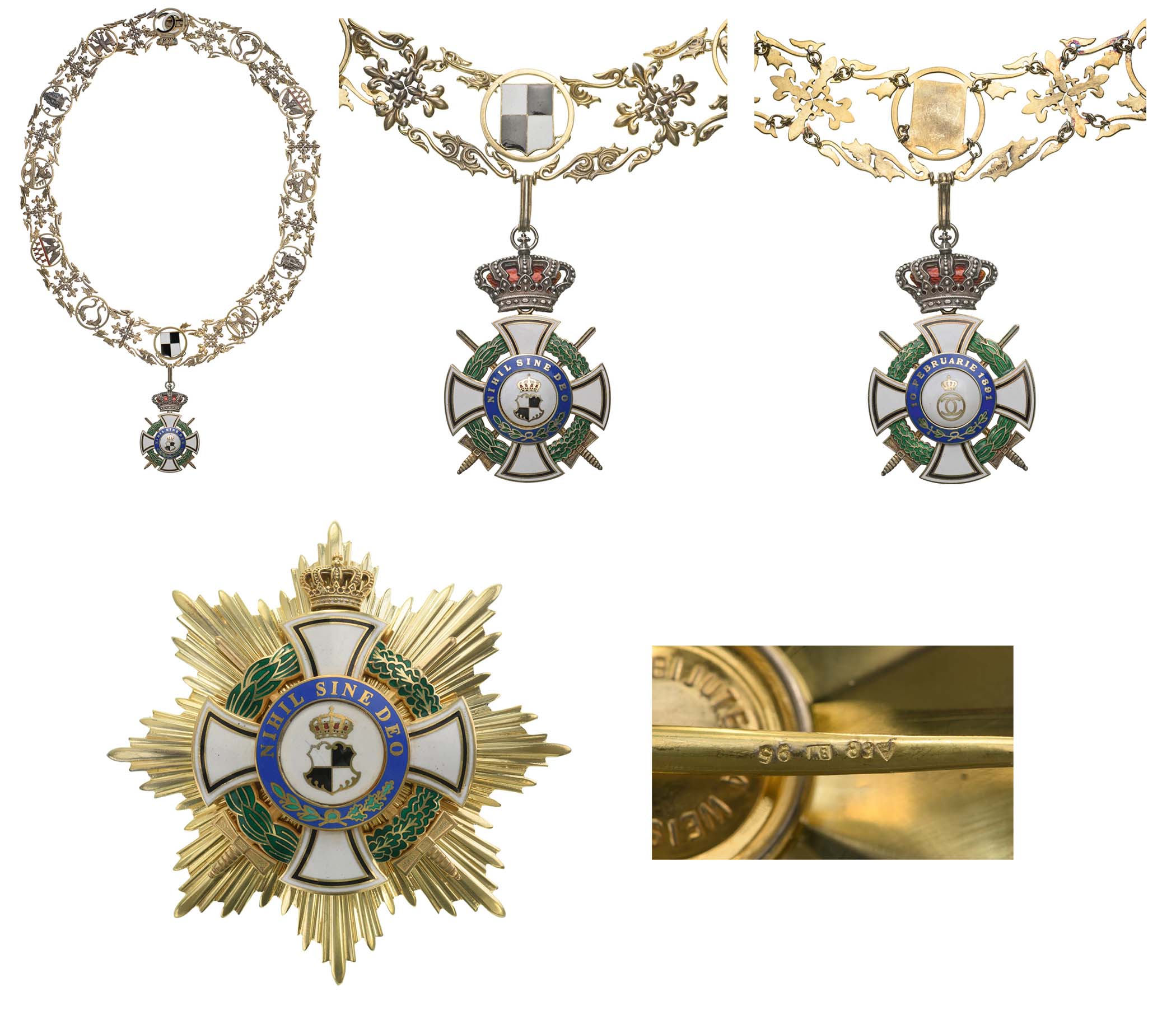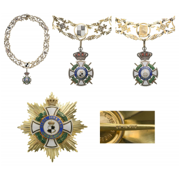 Military Collar Set of the 2nd Model. Badge in gilt Silver, maker`s mark "HW (Heinrich Weiss, Bucarest)", hallmark "crown", both sides enameled, blue enameled legend on obverse "Nihil Sine Deo" and on reverse "10 Februarie 1891", with original suspension red enameled crown, ring, loop, together with the collar chain consisting of gilt Silver and black enameled elements featuring the coat of arms of the Hohenzollern family; Grand Cross Star, 1st Model, Military, instituted in 1935. Breast Star, gilt Silver, maker's mark "BW, Heinrich Weiss, Bucarest", hallmarked "95-39, crown", cross pattee with convex edges and curved arms (sometimes called an ("Alisee" cross), white enamel and a black enameled stripe near the sides of the cross, blue enameled legend "Nihil Sine Deo", surrounded by a wreath of laurel leaves (left side) and oak leaves (right side), crossed swords through the center, white-enameled central medallion with black Romanian eagle with the Hohenzollern coat of arms on a shield on the eagle's chest, on the reverse medium pin. Of the highest rarity, 1st set ever in a public sale, in mint condition!Dim.: the badge, 52 mm; the star, 86 mm, the chain approx., 850,0 mm. I RR!