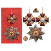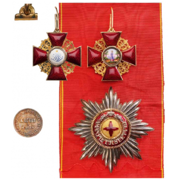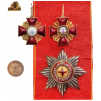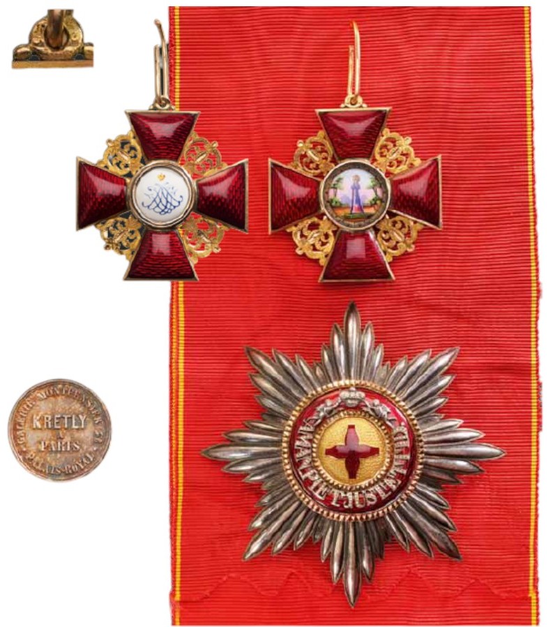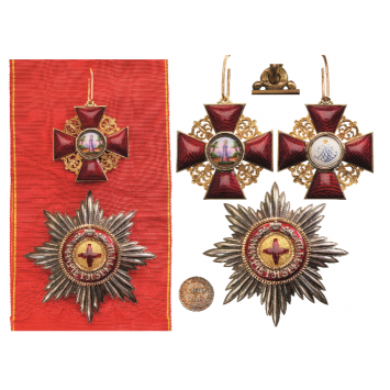 A 1st Class Set: Sash Badge in Gold, as a cross with the arms with bulbous, red translucent enamel, flanked by the typical ornamentation with chiseled details; obverse centre medallion with finest enamel miniature depicting the Saint, standing on a field with trees in the background; reverse centre medallion, with finely painted, growned monogram on white ground; round loop (struck with marks) with side-beads and suspension ring, with its original sash ribbon; breast star in silver, with polished rays, pebbled gold centre medallion with red enameled cross, within golden, beaded border; red enameled outer circlet with separately-made motto in silver “AMAN PIET JUSTET TID” silver Imperial crown sided by two angel-tenants; chiseled golden border; smooth reverse with maker’s escutcheon of Kretly, Paris.