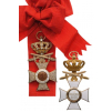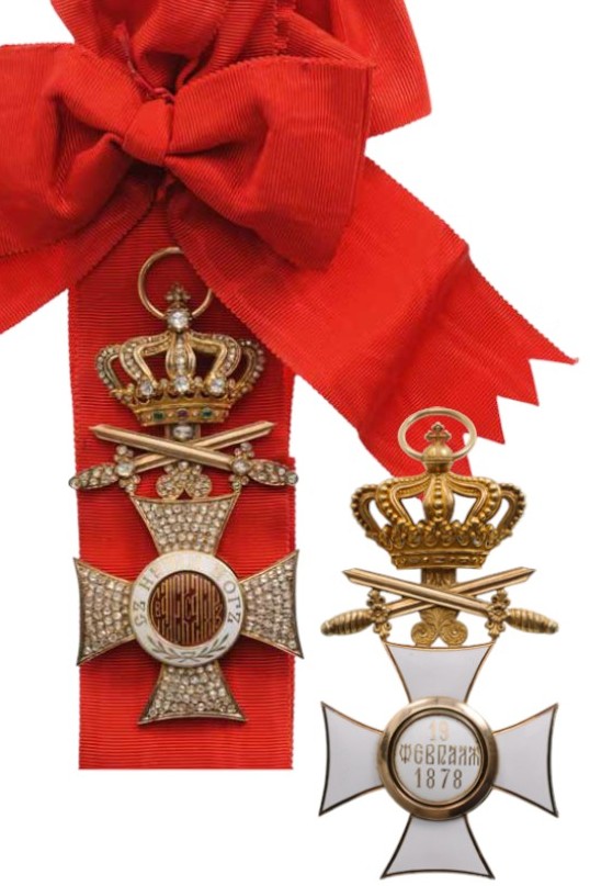 A jewelled First Class Badge with Swords of the 1st type: Golden cross, the obverse with the arms’ fields profusely set with brilliants and polished borders; red enameled, gold centre medallion with cyrillic inscription; white enameled medallion’s outer circlet, bearing the motto in golden lettering; trefoil- shaped, upper loop; the reverse with white enameled arms, applied to the main body; the Princely Bulgarian crown with the obverse face richly set with brilliants, rubies and emeralds, the orb, set with a large brilliant; golden swords with brilliant-set hilts; round suspension ring and original, red sash riband with bow.