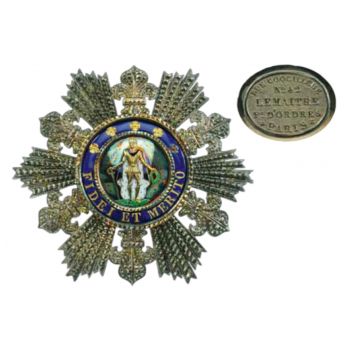 A Prince sized Grand Cross Breast Star with six chiseled and pierced rays, alternated by six fleurs- de-lys also finely chiseled and pierced; centre medallion in gold with applied, enameled image of the crowned St. Ferdinand in armour and royal robes, holding a sword and a green enameled wreath; blue enameled outer circlet with applied motto “FIDEI ET MERITO” in chiseled gold and laurel branches, jointed by five flowers; diamond-chiseled outer border, also made of gold; bright-polished reverse, with concave round counter-medallion; broad, vertical pin and two side hooks, maker’s mark escutchon of Lemaitre, Paris. An extremely rare, breast star for a young prince, of best French quality.