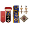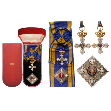 A Grand Cross set of the Order: Sash Badge in Gold, white enameled lilied cross, centre shield with polichrome enameled image of the saint in armour on red background, within deep-blue enameled border, bearing the Order’s motto “DEVS ET DIES” in gold lettering; reverse centre shield with Bourbones’ three golden fleurs-de-lys on translucent, deep-blue enamel; hinged suspension crown and original, full-length sash ribbon with rosette; Breast Star of roughly square form in Silver, with diamond-cut chiseled and pierced rays; superimposed order’s cross in gold and white enamel; oval centre medallion with beautiful image of the saint in armour on translucent red enamel of beautiful effect, within deep-blue enameled outer circlet bearing the order’s motto “DEVS ET DIES”, the reverse, with vertical pin; in the original, fitted, red case of issue with ducal crown embossed in gold on the lid.