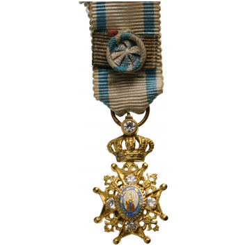 A jewelled Miniature of the Order in Gold, the arms and the upper orb, set with Brilliants; enameled obverse centre medallion with the saint wearing red robes; the ring, struck with an almost unreadable gold mark; original ribbon with the rosette of the Commander’s class and a silver suspension bar with pin.