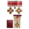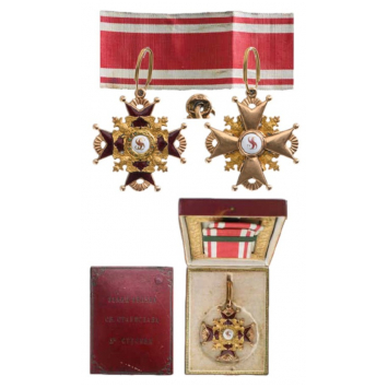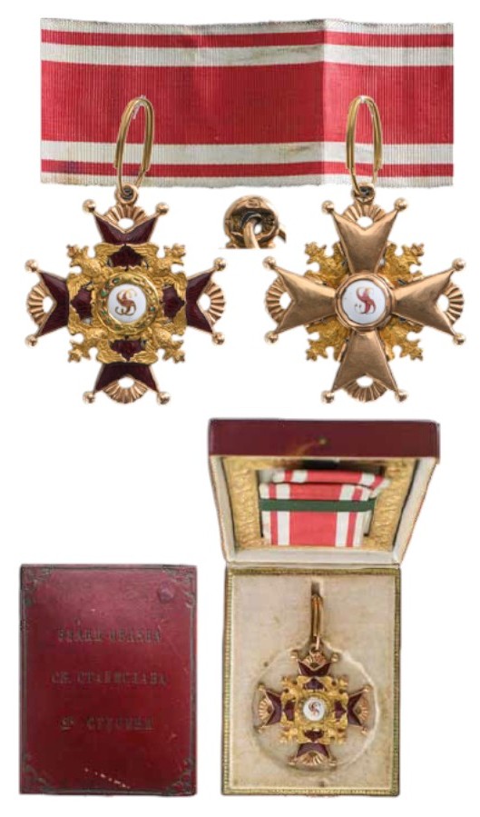 An early 19th Century 2nd Class Neck Badge of the Order in Gold, as a four-armed cross made of pink Gold, with red enamel to the obverse, flanked by yellow-gold eagles with spreaded wings; white enameled centre medallion with red, miniature-painted order’s monogram, within golden outer circlet, enriched with green enameled laurel wreath; smooth, polished reverse, with white enameled centre medallion, similar to the obverse’s one; ornamented upper loop, its ring, struck with Russian gold marks, and the date 1840; gold-wire, doubled ribbon ring and original, silk neck ribbon; in the original, red morocco case of issue with cyrillic inscrption embossed to the outer lid and fitted cream-velvet inner compartment.