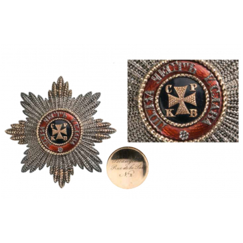 An early 19th Century, 1st Class Breast Star of the Order, with finely chiseled and pierced rays, four of which with gold overlay to the tips; black enameled centre medallion with chiseled cross, flanked by the initials “C”, “P”, “K”, “B”; red enameled outer circlet within double, beaded gold border, with the Order’s motto “ПОЛЬЗА ЧЕСТЬ И СЛАВА” (Benefit Honour and Glory), in finely chiseled and separately applied lettering; gilt, concave reverse, the counter- medallion engraved with jeweler’s name “Beaugeois / Rue de la Paix / N.° 2”.
