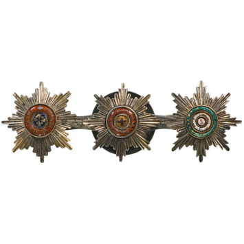 Resp. Of the Order of St. Vladimir, of St. Anne and of St. Stanislas; all with silver rays and enameled centres with gold details; all linked to the reverse and fitted with button for wear to the lapel.