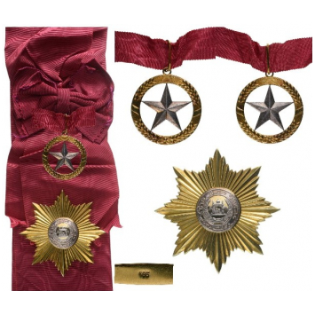 A complete set of the 1st Class after the Order’s reformation in more classes operated by King Muhammad Zahir Shah subsequently to his acces - sion to the throne in 1933: Sash Badge as an openwork appendant with a silver faceted five-pointed star within stylized wheat wreath in gold; round upper loop and oval suspension ring; with original sash ribbon; Breast Star in gold with polished rays; centre medallion in gold with the coat of arms of the Afghani Kingdom in silver within outer circlet bearing inscription in Arabic script; the reverse struck with gold mark and fitted with vertical pin.