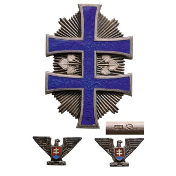 A Third Class Badge in Silver with blue enameled double cross (lime leaves visible through the translucent enamel), sided by two groups of three lime leaves each and resting on a star of thin, polished beams; smooth reverse with frosted finish, strong, vertical pin, this, struck with “987” and “K” marks; together, two screwback (the nut, missing) ribbon miniatures in silver, with enameled, Slovakian coat of arms.