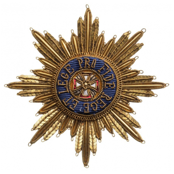 An early, embroidered 1st Class Star, the rays of gold sequines embossed sheet-gold and twisted gold and silver wire; all tips ending with tiny loops to affix the star to the habit; centre medallion made of gold-yellow silk with gold embroidered cross with sheet-silver arms and red silk borders; blue silk outer circlet with gold-embroidered order’s motto “PRO FIDE REGE ET LEGE” (For the Faith, the King and the Law”), the whole within a border of twisted, concentric, gold wires; the reverse backed with strong paper and an ancient, inventory label.