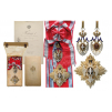 The extraordinary set of 1st Class (Grand Cross) together with awarding document to General Louis Joffre: Sash badge in gilt Silver as a white enameled double-headed eagle with red enameled, oval centre medallion bearing the gilt and enameled coat of arms of Serbia within moulded and beaded outer circlet; upper, Royal crown with long, blue enameled scrolling pendalia, link ring and broad, grooved and beaded suspension ring, the reverse with red enameled centre medallion bearing the year “1882”, within outer circlet similar to the obverse from which two prongs depart to reinforce the suspension to the crown’s pendalia; fitted with original, full-length sash ribbon; Breast Star in gilt Silver with polished and chiseled rays, the centre as the sash badge’s obverse, but smaller, with elegantly chiseled and engraved details, the reverse, fitted with vertical pin; the whole, in its original, off-white case of issue, the lid with gold embossed coat of arms and indication of the class and fitted, inner compartment; with original award document to Louis Joffre as Général de Division and French Chief of Staff, dated in Belgrade on March 5th, 1912, with original signature of King Peter and of the Chancellor of the Royal Serbian Orders.