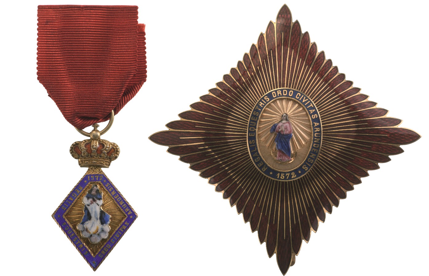 Breast Badge in the form of a vertical rhombus in Gold with blue enameled border bearing the inscription “REGALIS EQUESTRIS ORDO CIVITAS ARUNDENSIS 1572” in gold lettering within chiseled borders; the centre with separately-made, polychrome enameled image of the Holy Virgin on golden ground engraved with beams; suspension crown with enameled details, round ring and original, red silk ribbon; Breast Star in Gold with gold-bordered, red enameled rays; oval centre medallion in gold with the polychrome enameled image of the Holy Virgin in the finest enamel miniature on chiseled, beaming ground; night-blue enameled outer circlet bearing the inscription “REGALIS EQUESTRIS ORDO CIVITAS ArundEnsis 1572” in golden lettering; concave, polished reverse, fitted with vertical pin.