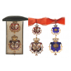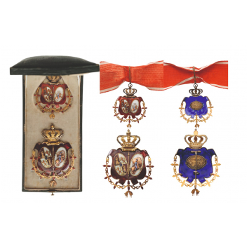 A complete set to a member of the Real Maestranza: Neck Decoration in Gold: red enameled shield, two ovals depicting the royal arms of Spain and Sevilla, divided by a vertical, gold sceptre; the whole encircled by the collar of the Order of the Golden Fleece with red enameled flames and separately- made, chiseled badge of the Order; upper, royal crown, with grooved ribbon ring; deep-sea-blue enameled reverse, applied, gold escutcheon with inscription “SOCIET. EQUESTRIS HISPAL.”; with original neck ribbon; Breast Bagde in Gold, similar to the neck decoration, also of the finest quality and excellent enamel-work; the reverse fitted with vertical pin and the maker’s escutcheon of Chobillon, Paris; in the original, black morocco case of issue, with fitted inner compartment and silk-covered inner cushion.