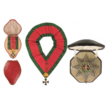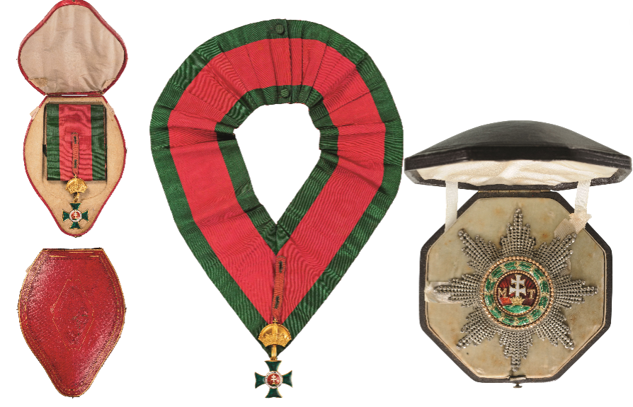 A complete grand Cross set: Sash Badge in Gold, the arms with translucent, green enamel on both sides; red enameled centre medallion with white patriarch’s cross, sided by the golden initials “M” and “T”, rising from a chiseled crown, resting on three, green enameled mounts, white enameled outer circlet bearing the black painted inscription “PUBLICUM MERITORUM PRAEMIUM”; white enameled reverse centre medallion, bearing the inscription “STO. ST:RI AP” (“Sancto Stephano Regi Apostolico” (to St. Stephen, the Apostolic King), bordered by a stylized, enamel-painted laurel wreath; upper loop of baroque style (struck with a “H” mark), and grooved, long suspension ring, fitted with a section of the order’s ribbon with button-holes, through which is inserted a separate, golden, uniface St. Stephen’s crown, whose reverse is fitted with golden retaining bars; with two Grand Cross sashes for wear on the priest’s robe, around the neck; Breast Star with chiseled and pierced silver rays, the centre in gold with red enameled medallion with separately-made, white enameled patriarch’s cross sided by chiseled, golden initials “M” and “T”, rising from three green enameled mounts; beaded golden borderand white enameled outer circlet enriched by a beautifully- made, green enameled oak wreath, enclosed by a larger, beaded border in gold and a further one in silver, with stylized, ornament; the reverse, fitted with vertical pin; in the original, red morocco case of issue, with ornamented outer lid and fitted, inner compartment. Together, from the same property, a cast bronze uniface medallion (work of C. Voigt, 1850), commemorating the Cardinal’s appointment as Nuntius in Vienna.