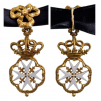 A Knight’s Cross of the Order in Gold with white enameled arms, flanked by fleurs de lys, enclosed in an elaborate frame of artistically bent and twisted gold wire, ending with a small sphaerical appendant below; on top, the typical lilied crown with suspension loop as a stylized rosette; ribbon ring with riveted ends, enriched by a beautifully formed, embossed bow with chiseled details; with black, silk ribbon.