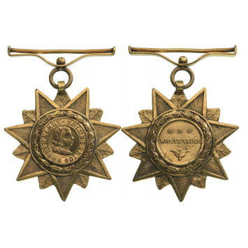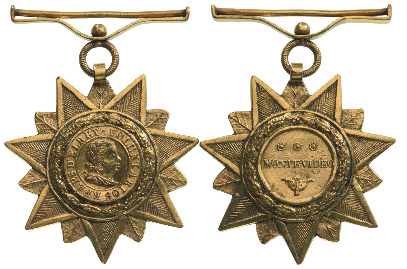 Decoration for Officers in Gold of the 1st version, as a seven-pointed star, its rays flanked by stylized palmettes (or tips of laurel leaves); centre medallion with the laureated head of Don Joao VI King of Portugal facing right, within border with embossed inscription “VOLUNTARIOS REAES DEL REY”, the whole enclosed within a border of embossed oak leaves; strong upper loop, round, grooved ring and pivoting, horizontal suspension bar; the reverse with broad centre medallion bearing the inscription “MONTEDIVEO” within three rosettes above and acanthus leaves below, the whole within a border of embossed oak leaves.