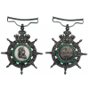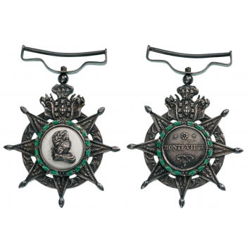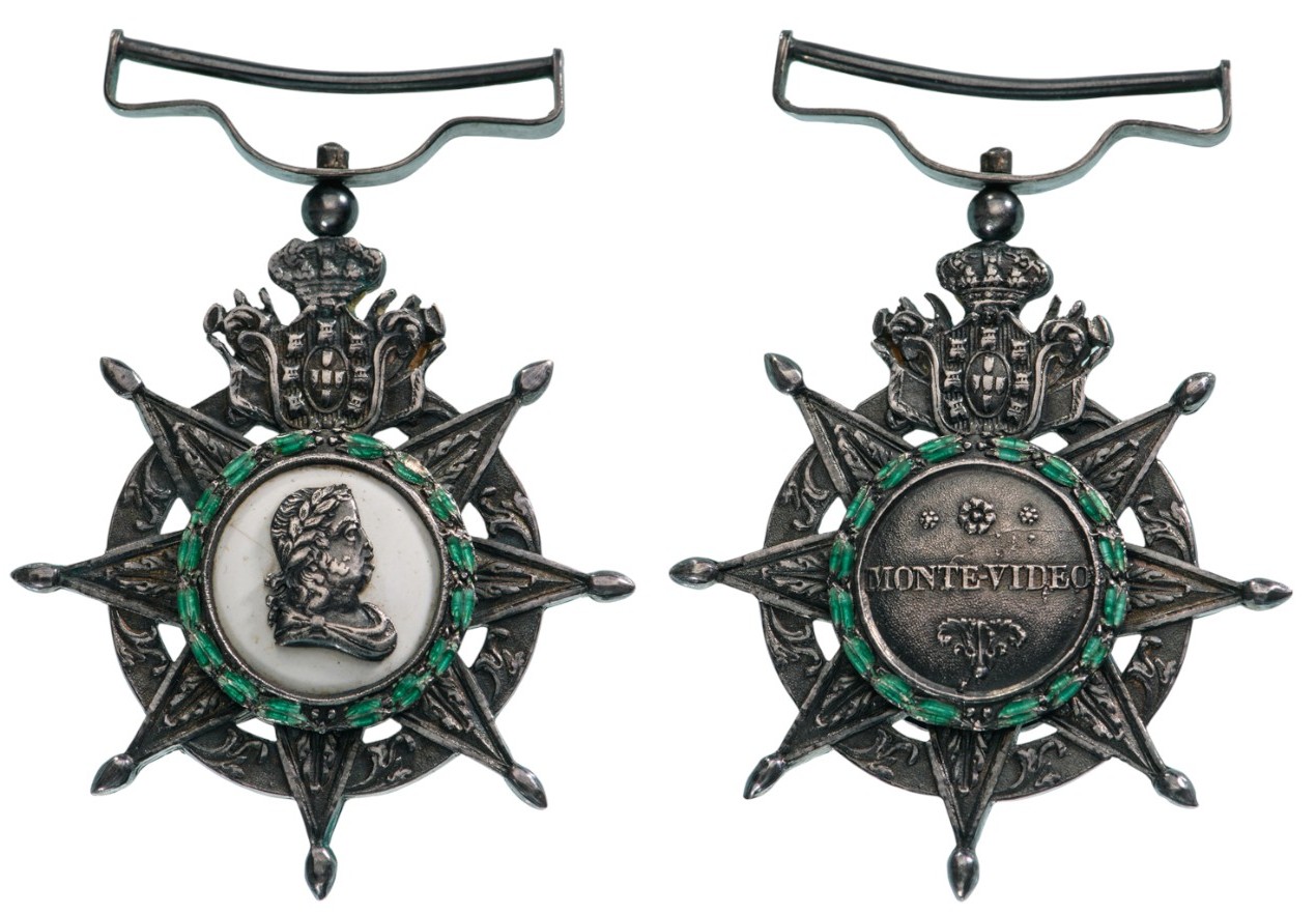 Decoration for Officers in Silver of the 1st version, type for civilian of rank compared to generals, as a seven-pointed star, its rays flanked by a flat ring embossed with acanthus leaves; white enameled centre medallion with the laureated head of Don Joao VI King of Portugal facing right, within border as a green enameled, narrow laurel wreath; above, the crowned coat of arms of Portugal, on top of which is affixed the pivoting, horizontal suspension bar; the reverse with centre medallion bearing the embossed inscription “MONTEVIDEO” within three rosettes above (the central one, larger) and acanthus leaves below, the whole within green enameled laurel wreath.