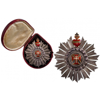 A Breast Star of the Order in the typical, Brazilian, somewhat reduced size with straight, broadening smooth/grooved rays with swallow’s tail ends; polished silver centre medallion bearing the order’s cross in gold and enamels, with chiseled details; round border and a scrolling, polished outer circlet; on top, the enameled sacred heart in gold; smooth concave reverse, fitted with pin; in the original, red morocco “drop”-shaped case with black velvet inside af ivory silk lined inner cushion.