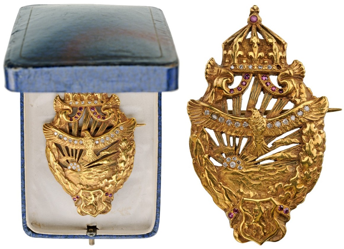 Made of solid Gold: laurel and oak wreath enclosing an eagle with spreaded wings (these, set with six brilliants each), flying on a landscape with the beaming rising sun, enriched with brilliants; Bulgaria’s Royal Crown, its pendalia and orb, set with rubies; escutcheon bearing the lion rampant below, flanked by ruby-set ribands; the reverse, fitted with horizontal pin.