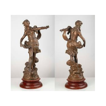 A large decorative régule (zamak) statue, light patina, mythological inspiration, young woman standing on a pearl rock, round marble pedestal with steps, overall height 50 cm, 20th century. Superbe! I
