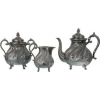Three-piece set consisting of a large coffee maker, a covered sugar bowl and a milk jug. Low-grade silver and amalgam tin and copper, beautiful homogeneous pattern with twisted ribs on a ""bat"" wings background, decorative volutes, foliated body and handles, feet skates, neo-gothic style, period work from the end of the 19th century in the Austro-Hungarian sphere. Respective height 20, 19 and 13 cm, indicative weight 1500 g for the whole. Respective height 20, 19 and 13 cm, indicative weight 1500 g for the whole. Presence of many punches. A superb set in extremely fine condition!